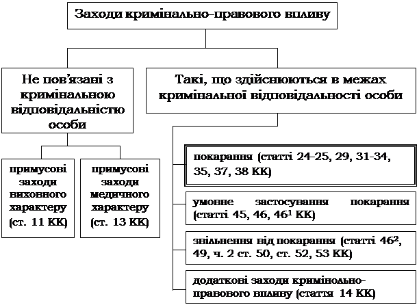 Також необхідно визначити місце покарання в системі заходів кримінально-правового впливу (див. схему 1).(2) Чинне кримінальне законодавство України передбачає ряд заходів кримінально-правового впливу. Вони можуть застосовуватись як до особи, яка вчинила злочин, так і до особи, яка вчинила суспільне небезпечне діяння, що не є злочином.