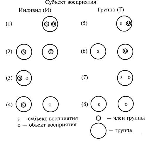 Еще сложнее обстоит дело в том случае, когда в качестве субъекта восприятия интерпретируется не только отдельный индивид, но и группа (Г). Тогда к составленному перечню процессов социальной перцепции следует еще добавить: восприятие группой своего собственного члена (5); восприятие группой представителя другой группы (6); восприятие группой самой себя (7), наконец, восприятие группой в целом другой группы (8). Хотя этот второй ряд не является традиционным, однако в другой терминологии почти каждый из обозначенных здесь «случаев» исследуется в социальной психологии. Не все из них имеют отношение к проблеме взаимопонимания партнеров по общению(3). Для того чтобы более точно обозначить, о чем идет речь в интересующем нас плане, целесообразно говорить не вообще о социальной перцепции, а о межличностной перцепции, или межличностном восприятии (или — как вариант — о восприятии человека человеком). Именно эти процессы непосредственно включены в общение в том его значении, в каком оно рассматривается здесь. Иными словами, в данном контексте речь идет лишь о
