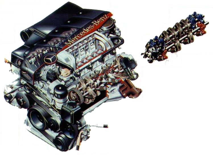 Двигатель автомобиля «Мерседес-Бенц-S500» (Евро IV) с регулируемым впускным трубопроводом, тремя клапанами на цилиндр, одним распределительным валом в головке, роликовыми толкателями и системой отключения четырёх из восьми цилиндров при работе с неполной нагрузкой: 4966 см3; 220 кВт/299 л.с.; 460 Нм при 3000 об/мин.