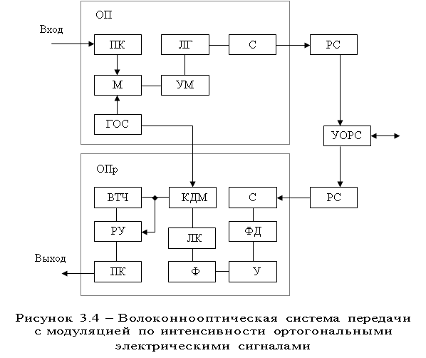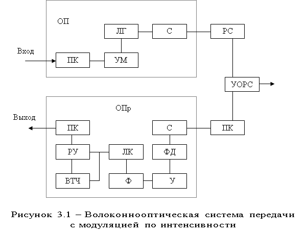Данная группа схем включает в себя одноволоконные оптические системы передачи с оптическими разветвителями, с оптическими циркуля-торами, устройствами спектрального уплотнения, а также фильтрами разделения мод оптического излучения. На рисунке 3.1 показана схема оптической системы передачи с модуляцией сигнала по интенсивности, содержащая блоки оптического передатчика (ОП), оптического приемника (ОП) устройства соединения станционного и линейного кабеля (УССЛК), разъемные соединители (РС), устройства объединения и разветвления оптических сигналов (УОРС).
