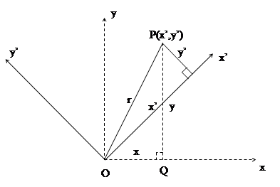 Існує дуже короткий шлях, який веде до відповіді і не потребує пошуку закону перетворення від старих координат (нештрихованих) до нових (штрихованих). На рисунку зображено основні деталі обох систем координат і показано розміщення точок О і Р відносно повернутих осей координат Ох’ і Оу’. Пряма PQ’ перпендикулярна осі х’. Відстань ОР (або r), та сама, що і раніше, тоді як координати х’ і у’ точки Р визначаються довжинами відрізків ОQ i QP. Але все таки з теореми Піфагора для прямокутного трикутника OQ’P слідує, що