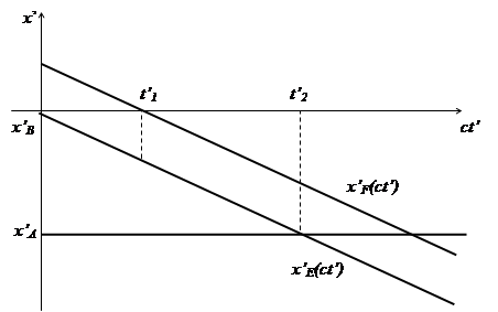 , коли події B i Fодночасні, а події x’E(ct’1) i x’A(ct’1) – неодночасні. Потім сарай рухається вздовж стержня і в момент