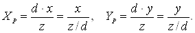 Кожну з проекцій можна описати матрицею розміром 4х4. Цей спосіб виявляється зручним, оскільки з'являється можливість об'єднати матрицю проектування з матрицею перетворення, представивши в результаті дві операції (перетворення і проектування) у виді однієї матриці. У цьому розділі ми одержимо матриці розміром 4х4 для декількох проекцій і насамперед для центральної. На рис.1 наведені три зображення лівосторонньої системи координат, у яких точка P проектується на проекційну площину, розташовану на відстані d від початку координат. Для обчислення координат Xр і Yp проекції точки (x, у, z) напишемо співвідношения, отримані з подібності трикутників (рис.1):