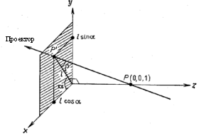 Рис. 4. Косокутна паралельна проекція Р'(l соsа, l sinа, 0) проекцією точки P (0, 0, 1).