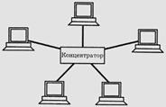 В центре сети с данной топологией помещается не компьютер, а концентратор, или хаб (hub), выполняющий ту же функцию, что и репитер. Он восстанавливает приходящие сигналы и пересылает их в другие линии связи. Хотя схема прокладки кабелей подобна истинной или активной звезде, фактически мы имеем дело с шинной топологией, так как информация от каждого компьютера одновременно передается ко всем остальным компьютерам, а центрального абонента не существует. Естественно, пассивная звезда получается дороже обычной шины, так как в этом случае обязательно требуется еще и концентратор. Однако она предоставляет целый ряд дополнительных возможностей, связанных с преимуществами звезды. Именно поэтому в последнее время пассивная звезда все больше вытесняет истинную шину, которая считается малоперспективной топологией.