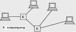 Применяются довольно часто и комбинированные топологии, среди которых наибольшее распространение получили звездно-шинная (рис. 1.8) и звездно-кольцевая (рис. 1.9).