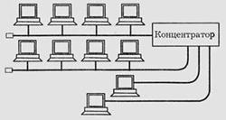 Звезда, показанная на рис. 1.2, носит название активной, или истинной, звезды. Существует также топология, называемая пассивной звездой, которая только внешне похожа на звезду (рис. 1.5). В настоящее время она распространена гораздо больше, чем активная звезда. Достаточно сказать, что она используется в самой популярной на сегодняшний день сети Ethernet.