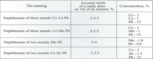 Правильный подбор композиционного состава сиккативов Co, Mn, Zn, Ca, Zr делают полиметальные сиккативы конкурентно способными по отношению к одноментальным, позволяют повысить цветостойкость пигментированных систем, что особенно важно для ярко-белых и пастельных тонов, повышают твердость и блеск, способствуют стабильности каталитических свойств металлов, уменьшают их адсорбию пигментами. Преимущество композиции с участием Ca и Zn беспорно. Они обеспечивают стабильность концентрации сиккативов, способствуют высокому диспергированию пигментов и значительному повышению активности основных сиккативов, не обнаруживают изменения вязкости связывающих и пигментированных систем, предотвращают смор-щивание пленки при значительной толщине покрытия.