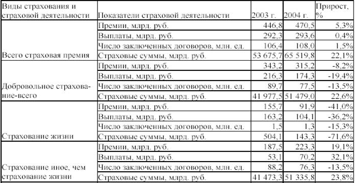 Макроэкономические обстоятельства не могли не повлиять на развитие национального страхового рынка. Общие темпы развития страхования в 2004 г. в целом оказались незначительными – суммарный сбор премии увеличился только на 5%, а общее число заключенных договоров – на 1,5%2. С другой стороны, страховые суммы по заключенным договорам (суммарная стоимость страхуемых интересов) выросла в 2004 году на 22%, а в страховании, ином, чем страхование жизни – на 24%. Страховые премии в этом сегменте выросли на 19%. Это показатель все же остается ниже инфляции, которая составила за 2004 г. в промышленном секторе более 28%.