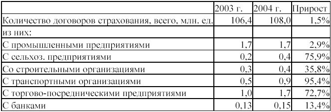 За 2004 год общее количество договоров страхования выросло на 1,5% и составило 108 млн. единиц. Надо отметить, что в 2004 г. произошло оживление деятельности страховых компаний по ряду направлений.