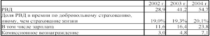 Конкуренция на российском страховом рынке в 2004 г. заметно обострилась. Об этом свидетельствует значительно опережение темпов роста расходов на ведение дела страховщиков над ростом премии. Так, премии по добровольному страхованию, иному, чем страхование жизни и ОСАГО выросли на 27%, а суммарные РВД по российскому страховому рынку – на 33%. Общий объем расходов на ведение дела составил 54,7 млрд. рублей. Доля оплаты труда в РВД выросла в 2004 г. до 43% от общего объема расходов против 40% годом ранее. Суммарная агентская комиссия по рынку увеличилась на 49%, достигнув 7,1 млрд. рублей.