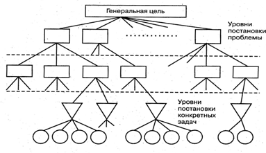 Могут быть цели различных иерархических уровней управления. Корпоративную цель или цель нулевого уровня называют генеральной. Далее идут цели первого, второго и т.д. уровней. Такое представление целей называют деревом целей (см. рис.1.1.2.)
