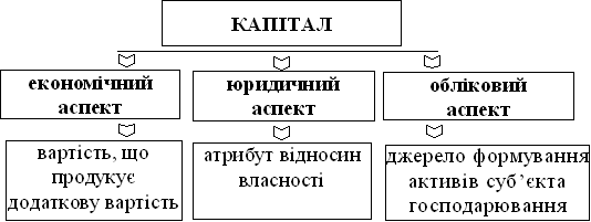 Дослідження власного капіталу потребує з’ясування сутності капіталу. Найважливішими аспектами розкриття сутності капіталу є економічний, юридичний, обліковий (рис. 1).