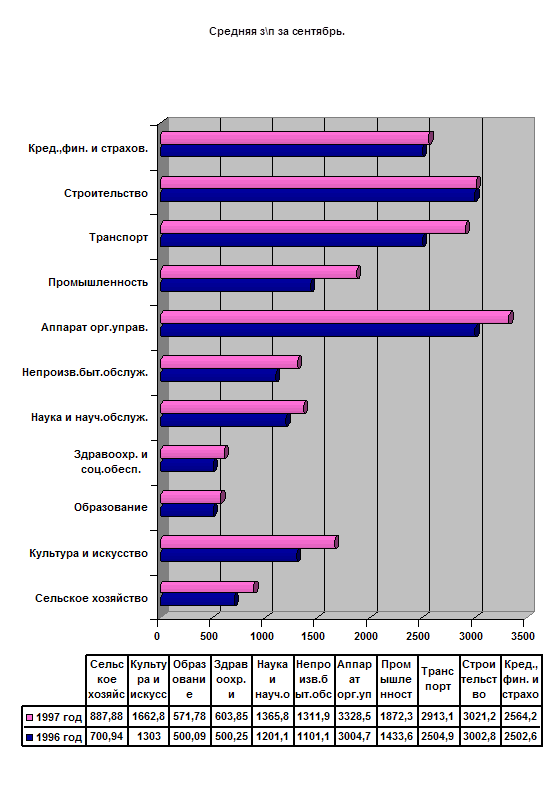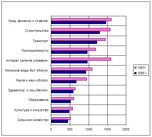 Средний прирост средней заработной платы на 1997 год по сравнению с 1996 годом составил 16,63%; причем Самый высокий показатель у «Промышленности» ( 30,6% ); далее идут «Культура и искусство», «Сельское хозяйство» и «Здравоохранение и соц.обеспечение» - >20%; а также «Непроизводственное бытовое обслуживание», «Транспорт», «Образование», «Наука» и «Аппарат органов управления» - >10%.