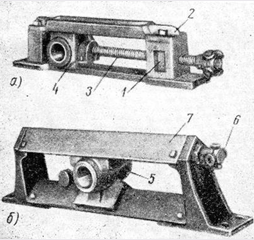 Винтовые натяжные устройства (рис.2) бывают двух типов. У первого (рис.2,а) гайка 1 винта закреплена неподвижно в раме 2 с направляющими, а сам винт 3 – в корпусе подшипника 4. Винт закрепляется таким образом, чтобы он мог свободно вращаться вдоль своей оси. При вращении винта последний перемещается в неподвижной гайке и тянет за собой корпус подшипника. Второй тип натяжного устройства (рис.2, б) отличается от первого тем, что гайка закреплена неподвижно в корпусе подшипника 5, а сам винт 6 – в раме 7.