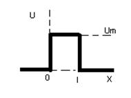 Для того чтобы в этом убедиться, мы рассмотрим совсем простой случай барьера, изображенный на рис. 2. Именно, мы будем считать, что потенциальная энергия частицы U (х) всюду равна нулю, кроме области 0 ≤ Х ≤ l, где она имеет постоянное значение, равное Um. Такой барьер представляет собой, конечно, идеализацию, но на нем, особенно просто можно проследить интересующие нас стороны проблемы. Мы можем себе представить, что такой прямоугольный барьер возникает путемнепрерывной деформации плавного барьера, изображенного на рис. 1.