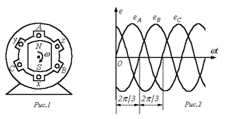 Источником трехфазного напряжения является трехфазный генератор, на статоре которого (см. рис. 1) размещена трехфазная обмотка. Фазы этой обмотки располагаются таким образом, чтобы их магнитные оси были сдвинуты в пространстве друг относительно друга на