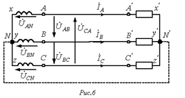 Линейным называется провод, соединяющий начала фаз обмотки генератора и приемника. Точка, в которой концы фаз соединяются в общий узел, называется нейтральной (на рис. 6 N и N’ – соответственно нейтральные точки генератора и нагрузки).