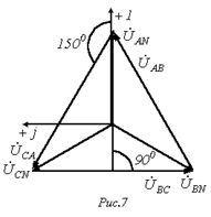 На рис. 7 представлена векторная диаграмма для симметричной системы напряжений. Как показывает ее анализ (лучи фазных напряжений образуют стороны равнобедренных треугольников с углами при основании, равными 300), в этом случае