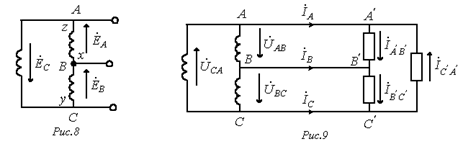 В связи с тем, что значительная часть приемников, включаемых в трехфазные цепи, бывает несимметричной, очень важно на практике, например, в схемах с осветительными приборами, обеспечивать независимость режимов работы отдельных фаз. Кроме четырехпроводной, подобными свойствами обладают и трехпроводные цепи при соединении фаз приемника в треугольник. Но в треугольник также можно соединить и фазы генератора (см. рис. 8).