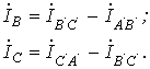 Очевидно, что при соединении в треугольник линейные напряжения равны соответствующим фазным. По первому закону Кирхгофа связь между линейными и фазными токами приемника определяется соотношениями