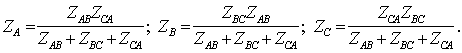 Значения тока в несимметричной нагрузке, соединенной треугольником, при заданных фазных ЭДС можно рассчитывать с помощью преобразования треугольника ZAB, ZBC, ZCA в звезду, сопротивления фаз которой выражаются формулами: