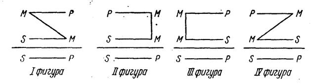 В фигуре 1 средний термин является подлежащим в большей посылке, сказуемым — в меньшей. В фигуре 2 он является сказуемым в большей посылке, сказуемым же и в меньшей посылке. В фигуре 3 он является подлежащим и в большей и в меньшей посылке, и, наконец, в фигуре 4 он является сказуемым в большей посылке и подлежащим—в меньшей.