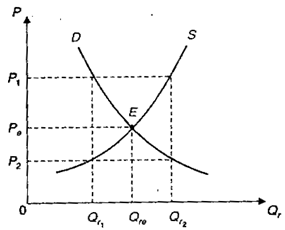 Для более подробного раскрытия понятий приведем график (рис.5). Для чего совместим кривые спроса и предложения одного и того же товара на этом графике. Линия D есть графическое изображение спроса от цены, линия S – графическое изображение функции предложения от цены. Точка их пересечения – это точка равновесия E. В данной ситуации объем спроса равен объему предложения (Qd = Qs), а цена спроса равна цене предложения (Pd = Ps), то есть рынок сбалансирован. Состояние рынка, при котором спрос и предложение уравновешены на определенном уровне цены, называется равновесным. Координатами точки пересечения кривых спроса и предложения E является равновесная цена Pe и равновесный объем производства Qre. В таких условиях производителям данного товара невыгодно дальнейшее расширение производства, а значит, и предложения, так как товар не найдет спроса. В свою очередь покупатели этого товара именно на такой объем предложения и рассчитывали, цена предложения их также устраивает.