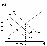 Под влиянием неценовых факторов происходит изменение спроса. Перемещение кривой D в положение D1, при увеличении спроса, при уменьшении — в D2.