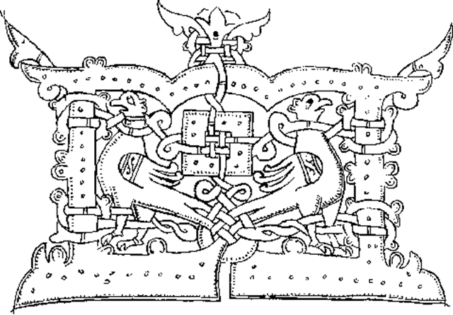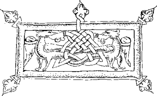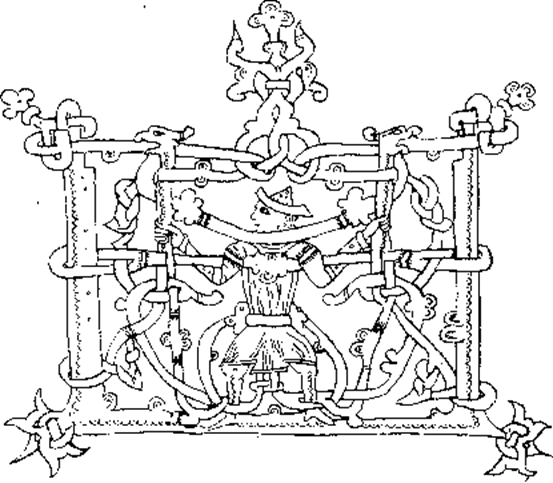 Их заставки имеют форму прямоугольного четырехугольника, внутри которого находятся или чудовищные звери и птицы (по два, в симметрическом расположении), перевитые ремнями и ветвями до такой степени, что нельзя определить, где оканчивается животное и начинается ремень или ветвь, или человек, весь запутанный в плетения из ремней и ветвей