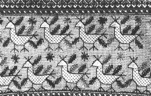 Орнаментальные мотивы сгруппированы следующим образом: 1) геометрические мотивы (рассматриваются лишь попутно, поскольку они входят как составная часть в сюжетную-вышивку); 2) зооморфные мотивы, включающие орнитоморфные, а также тератологические мотивы; 3) растительная орнаментика (pастительный мир занимал видное место в орнаменте русской вышивки XVIII-начала XX в. Растительные узоры издавна были известны в древнерусском прикладном искусстве, в архитектуре X-XIII вв., в рисунках заглавных букв рукописей XII- XIV вв. На колтах, наручах изображались ростки, крины. Мотив мирового дерева, или древа жизни, исстари был известен в искусстве Восточной Европы. Особое значение дерева, растительности выступает и в вышивках XVIII-начала XX в. Дерево составляло центр композиции, к которому обращены животные, птицы; дерево являлось объектом поклонения всадников или всадниц); 4) антропоморфные мотивы, подразделяемые на две большие группы: а) архаические, отражающие древние мифологические представления, б) бытовые (или жанровые).