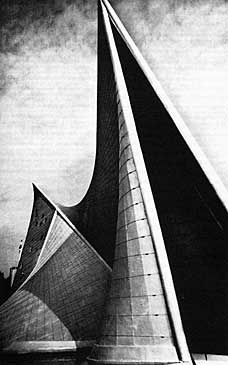 Его основная конструкция, винтовая в основе, с туго натянутыми металлическими растяжками, напоминает архаический струнный музыкальный инструмент, что-то вроде арфы. Исполнявшаяся внутри павильона аудио-визуальная программа под названием «Электронная поэма», - плод коллективного творчества. Аудиоряд «поэмы» был создан и записан Ксенакисом и Варезом. Это трёхминутный, беспрерывно повторяющийся опус под названием «Concret PH» Легенда гласит, что эта музыка была изготовлена так: композитор поджёг микрофон, который записывал горение собственного корпуса и мембраны. Более трезвая версия утверждает, что Ксенакис записал треск углей и потом из тысяч кусочков склеил свою музыку. Конструкция павильона предвосхитила появления целого направления в строительстве павильонов (например, вантовые перекрытия Олимпийского комплекса в Токио, архитектор Кендзо Танге).