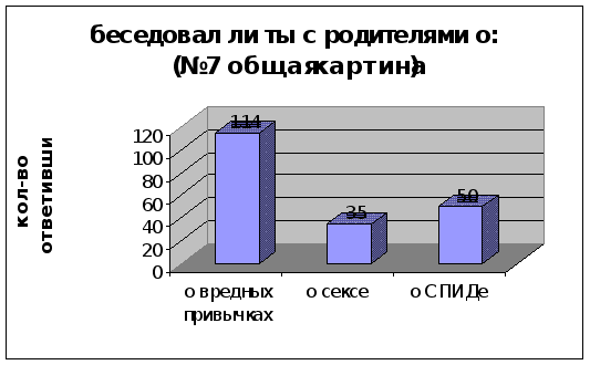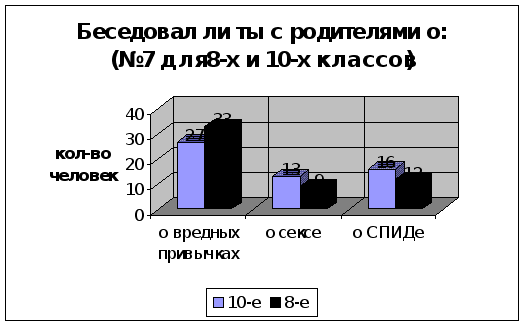 Рассмотрим результаты вопроса №7(диаграмма4). Заметны довольно странные показатели: о вредных привычках в 8-ом классе бесед с родителями было больше, чем в 10-ом. Это можно объяснить постепенной «адаптацией» наших родителей к современной жизни: мол человек в десятом классе- всё уже знает, человек в восьмом классе- надо с ним поговорить, но не о сексе и о СПИДе, а о вредных привычках. Странная склонность родителей разговаривать о СПИДе, не затрагивая при этом тему секса, видна в обоих случаях, что доказывает их некомпетентность в данной области.