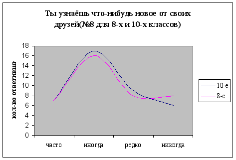 График1 наглядно демонстрирует нам, что от друзей в десятом классе узнать можно гораздо больше чем в восьмом, т.к. линия 10-х кл. находится над линией 8-х кл. и только над ответом «я ничего не узнаю от своих друзей» они пересекаются. Наверное, это можно объяснить тем, что к десятому классу разговоры на эту тему становятся обычными.