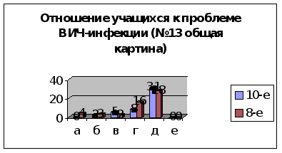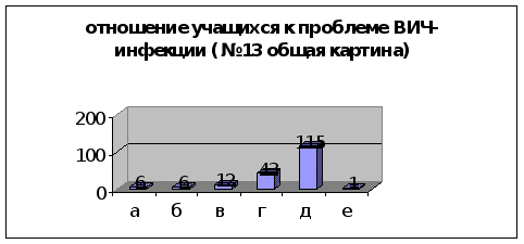 тношение к данной проблеме мы изучили с помощью специфического вопроса-ситуации(13). Глядя на диаграмму(см. диаграмму10) видно, что большинство подростков сами готовы бороться со СПИДом как с проблемой социальной, но, скорее всего, не знают как, о чём свидетельствует сравнительно низкий показатель информированности, а также то, что треть ответила «На тебя это не повлияет». Мы это вывели из того, что достаточно малое количество тестируемых готово пренебречь дружбой, и достаточно много людей готово помочь другу, узнав, что он заражён ВИЧ. также можно заметить, что они далеки от сознания того, что такого человека можно уважать.