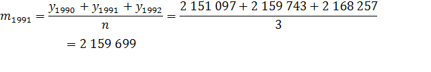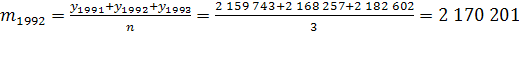 Для временного ряда показателя «Численность населения на 1 января» определим величину интервала сглаживания: =3. Исходные данные представлены в приложении 1. Рассчитаем скользящую среднюю для первых трех периодов: