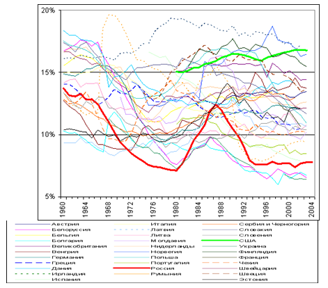 Рисунок 3. Доля третьих рождений в общем числе родившихся в 32 промышленно развитых странах в 1960-2003 годах, %