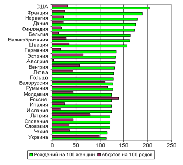 Напротив, такая черта российской рождаемости, как чрезмерное использование для ее регулирования искусственного аборта, резко отличает Россию от большинства развитых стран. Аборт как крайняя мера, к которой прибегают женщины, чтобы избежать нежеланного рождения, применяется практически во всех этих странах. Распространенность этой меры, которая повсеместно считается нежелательной по нравственным, религиозным и медицинским соображениям, в разных странах не одинакова. Но даже с учетом этой неодинаковости Россия на общем фоне выглядит белой вороной.