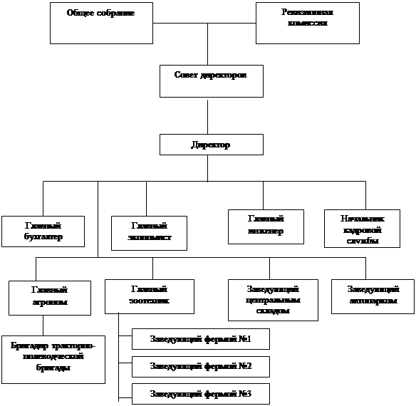 Структура управления - это система взаимосвязей и подчиненности должностных работников. Структура управления в ЗАО "Глинки" имеет вид классической концепции, исторически сложившейся иерархии, то есть наблюдается передача полномочий от высших к низшим уровням управления в хозяйстве. Рассмотрим структуру управления ЗАО "Глинки" на основании рисунка 2.