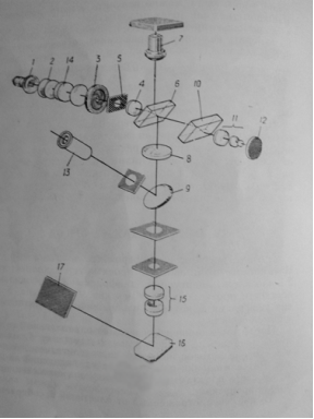 Для работы с монохроматическим светом, т.е. светом определенной длины волны, прибор снабжен двумя интерференционными светофильтрами 14, которые включаются и выключаются из хода лучей перемещением направляющей. Светофильтры отличаются друг от друга своими характеристиками.