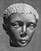 В этой голове привлекает внимание прежде всего прическа – высокая, пышная и воздушная – из множества крупно завитых локонов. Они обрамляют прекрасный, чистый лоб, составляя яркий контраст с ее точеным, красивым лицом. Хороши и пушистые брови, миндалевидные глаза, изящный нос и довольно полные губы красивого рисунка. Легкий наклон и поворот головы, длинная шея придают этому изображению особую поэтичность18. Для техники исполнения характерно обильное применение бурава, при помощи которого выполнены локоны прически, достигнут контраст света и тени в трактовке волос; поверхность лица гладкая, слегка полированная.