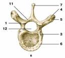 В строении отдельного позвонка выделяют тело позвонка и дугу позвонка, которая замыкает позвоночное отверстие. На дуге позвонка расположены отростки различной формы и назначения: парные верхние и нижние суставные отростки, парные поперечные и один остистый отросток, выступающий от дуги позвонка назад. Основание дуги имеет так называемые позвоночные вырезки — верхнюю и нижнюю. Межпозвонковые отверстия, образованные вырезками двух соседних позвонков, открывают доступ к позвоночному каналу слева и справа (рис. 3, 5, 7, 8, 9).
