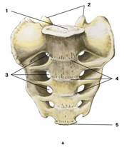 Задняя (дорсальная) поверхность крестца, также имеющая 4 пары задних крестцовых отверстий (рис. 10), неровная и выпуклая, с проходящим по центру вертикальным гребнем. Этот срединный крестцовый гребень (рис. 10) является следом сращения остистых отростков крестцовых позвонков. Слева и справа от него находятся промежуточные крестцовые гребни (рис. 10), образованные срастанием суставных отростков крестцовых позвонков. Сросшиеся поперечные отростки крестцовых позвонков формируют парный латеральный крестцовый гребень.