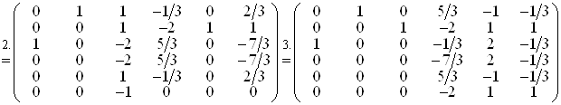 2.Перший рядок отриманої матриці поділимо на (–3) і, додаючи до інших рядків матриці отриманий перший рядок з деякими множниками, досягаємо того, щоб у другому стовпці стояли нулі, крім елемента а12.