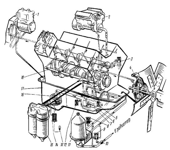 1—компрессор; 2—топливный насос высокого давления; 3—выключатель гидромуфты; 4—гидромуфта; 5, 12—предохранительные клапаны; 6—клапан системы смазки; 7—насос масляный; 8—перепускной клапан центробежного фильтра; 9—сливной клапан центробежного фильтра; 10—кран включения масляного радиатора; 11—центробежный фильтр; 13—лампа сигнализатора засоренности фильтра очистки масла; 14—перепускной клапан полнопоточного фильтра; 15—полнопроточный фильтр очистки масла; 16—маслоприемник; 17—картер; 18—главная магистраль