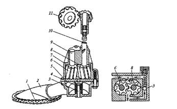 1 — сетка; 2 — патрубок; 3 — клапан; 4 — пружина; 5 — крышка; 6, 8, 11 — шестерни; 7 — корпус; 9 — ось; 10 — вал