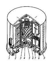 Рис. 5. Масляный фильтр; 1 — корпус; 2 — днище; 3, 5 — клапаны; 4, 6 — отверстия; 7 — кольцо; 8— крышка; 9 — фильтрующий элемент