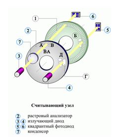 Конструктивно эти задачи решает инкрементный узел преобразователя перемещений. Первую из них решает механическая часть этого узла, обеспечивая необходимую точность растрового сопряжения лимба и анализатора, а также сносность последних по отношению к оси вращения вала. Вторую - реализуют осветители, фотоприемники и плата электрической схемы выделения и обработки информации о перемещении. Излучающий диод 3, конденсор 7, формирующий параллельный пучок лучей осветителя, окна А, А, В, В анализатора и фотоприемник 6 образуют так называемый канал считывания. Требование повышенной точности преобразователей перемещений диктует применение двух или четырех диаметрально расположенных каналов считывания.