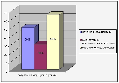 Более 50% пациентов платят за лечение в стационарах, 30% - за амбулаторно-поликлиническую помощь, 65% - за стоматологические услуги (11). Это можно увидеть на рисунке 2.
