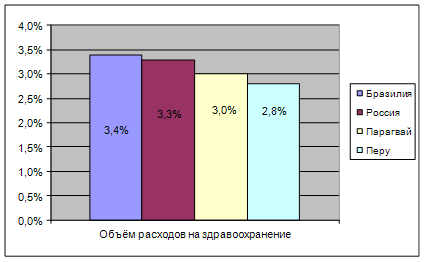 Объем государственных расходов в России на здравоохранение в 2009 составляет 3,3%. в доле ВВП. Примерно на таком уровне приоритетности здравоохранения находятся развивающие страны со средним уровнем дохода (Бразилия – 3,4%, Парагвай – 3,0%, Перу – 2,8%).